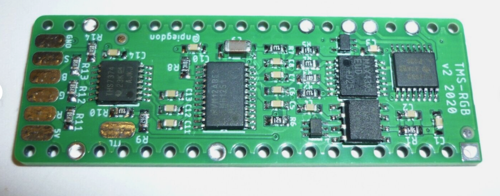 Próximo na lista de melhoramentos em computadores retro está a ligaçã de uma placa de circuito integrado, que converte o sinal de video de um computador Texas Instruments TI99A para RGB. O objectivo é obter uma imagem consideravelmente melhor. Abaixo está uma imagem da placa TMS-RGB :