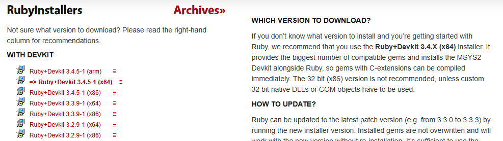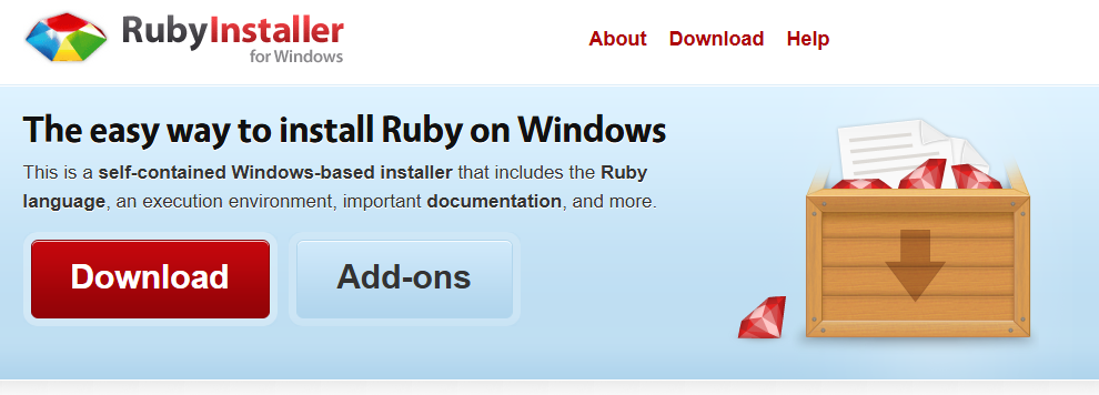 First, the Ruby implementation has to be specific to Windows. I went with Ruby Installer (linked here)